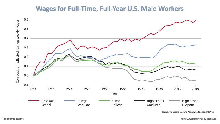 This figure shows in mathematically adjusted terms the inflation-adjusted wages of U.S. men by level of education since the year I was born. (I could show you the same graph for women, but this one makes the point with more clarity). Each line color represents a different level of educational attainment.
